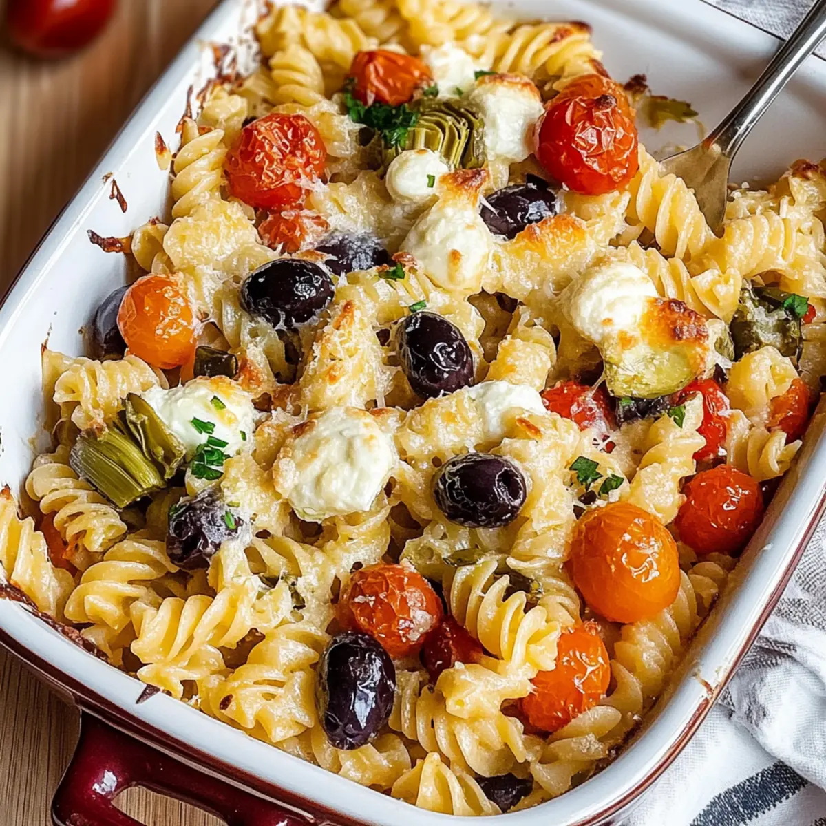 As the aroma of garlic and fresh herbs waft through my kitchen, I can’t help but feel transported to a sun-soaked Mediterranean village. This Baked Mediterranean Pasta is not just a meal; it’s an adventure for the senses that turns any ordinary evening into a delightful celebration. Packed with juicy cherry tomatoes, tender artichoke hearts, and rich kalamata olives, this vegetarian casserole embodies comfort while being incredibly easy to prepare. One of the best perks? It’s fully customizable! You can toss in seasonal vegetables or add protein to cater to your family’s tastes. The bubbling melty mozzarella on top just seals the deal, making it a guaranteed crowd-pleaser. Whether it’s a busy weeknight or a special gathering, this dish promises to impress every time you serve it. Ready to take your cooking game to the next level? Let’s dive into the delightful process of creating this flavor-packed gem!