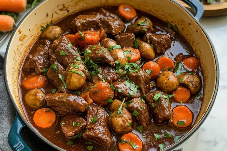 Return the browned beef and carrots to the pot, mixing them into the aromatic broth. Cover the pot with a lid and transfer it to your preheated oven. Bake for 2 hours, stirring halfway through, until the beef is tender and the sauce has thickened into a rich, velvety consistency.