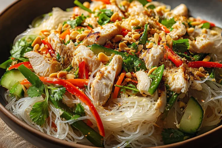 Sprinkle a generous handful of fresh herbs—mint, basil, and cilantro—over the assembled salad. These aromatic additions not only enhance the salad’s flavor profile but also contribute to its vibrant presentation. Toss everything lightly to incorporate the herbs without bruising them, giving your Chicken Vermicelli Noodle Salad a fragrant, delicious lift that’s irresistible.