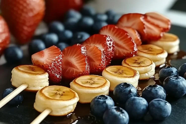 - Assemble the skewers by layering pancakes and fruit: pancake, strawberry half, pancake, banana slice, pancake, and blueberry on top.