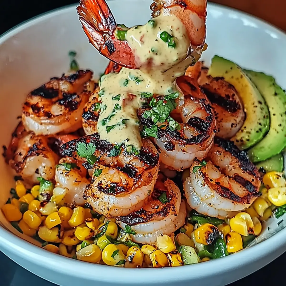 - Take serving bowls and start layering with the vibrant corn salsa at the bottom. Add the grilled shrimp on top, making sure they are neatly arranged. For a delightful creaminess, slice or mash avocado and place it alongside the shrimp. This creates an eye-catching presentation that highlights the delicious components of your Creamy Garlic Sauce Grilled Shrimp Bowl.