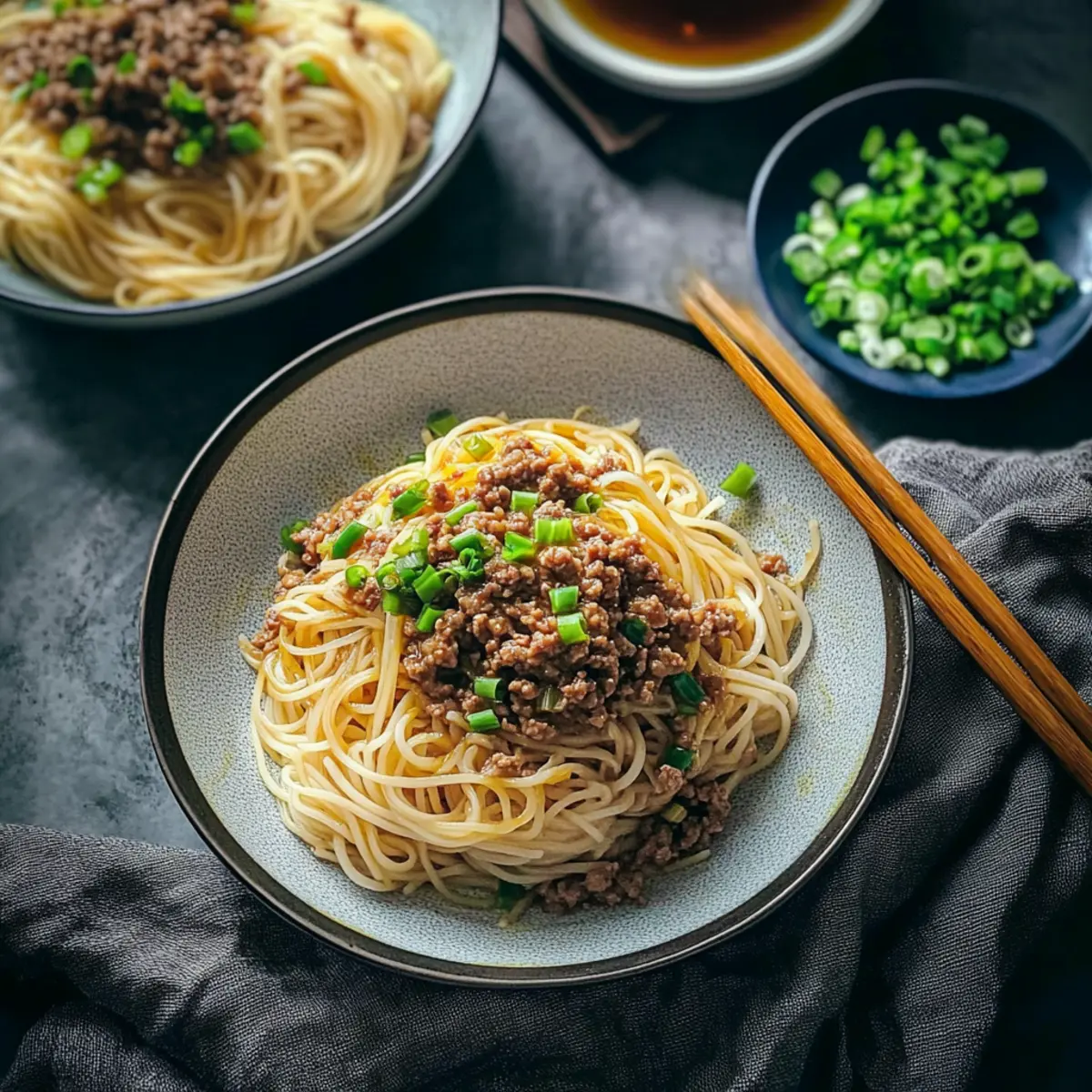 Finally, add the drained vermicelli into the beef sauce, tossing gently to ensure even coverage. Serve your Ground Beef Asian Noodles warm, topped with freshly chopped spring onions for a delightful crunch. Drizzle with optional Chinese dark vinegar and chili oil to enhance the flavors even further, if desired.