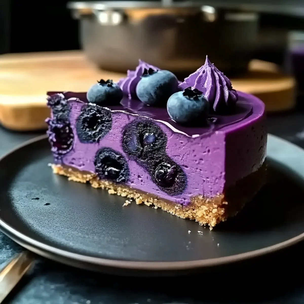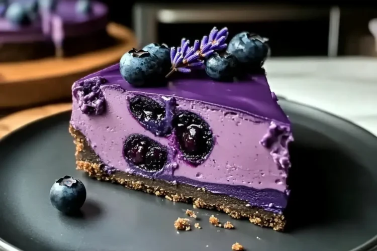 Decadent Layers: This midnight cheesecake combines rich cream cheese and a luscious blueberry lavender swirl that is both vibrant and aromatic.