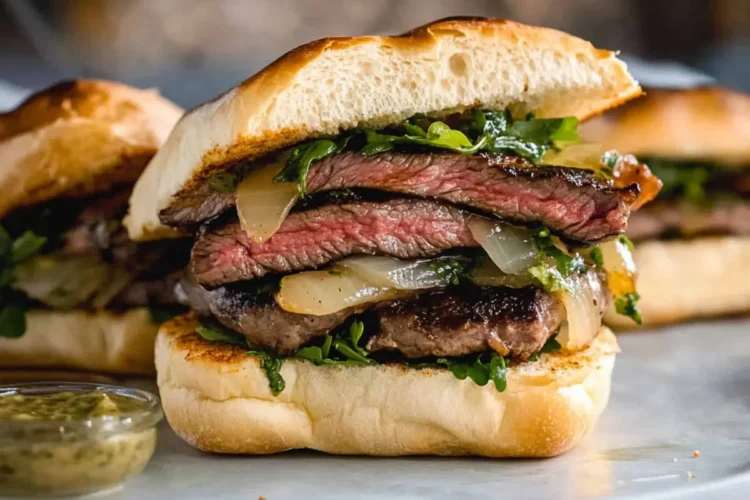 - Spread mayonnaise on the melted cheese side of toasted rolls. Stack sliced ribeye, sprinkle with flaky sea salt, and layer with caramelized onions and chimichurri. Add arugula, close sandwich, and serve immediately.