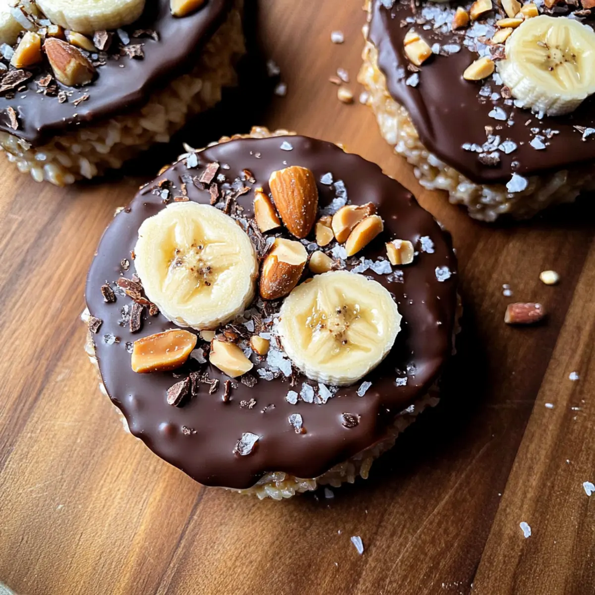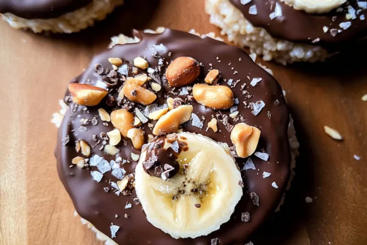 Once your rice cakes are prepped and the chocolate mixture is ready, layer sliced bananas atop the peanut butter on each cake. Drizzle the warm chocolate mix over the bananas, generously covering them for a rich flavor. For added crunch and a hint of saltiness, sprinkle chopped peanuts and a touch of flaky sea salt on top, elevating your Rice Cake Treat Recipes to the next level.