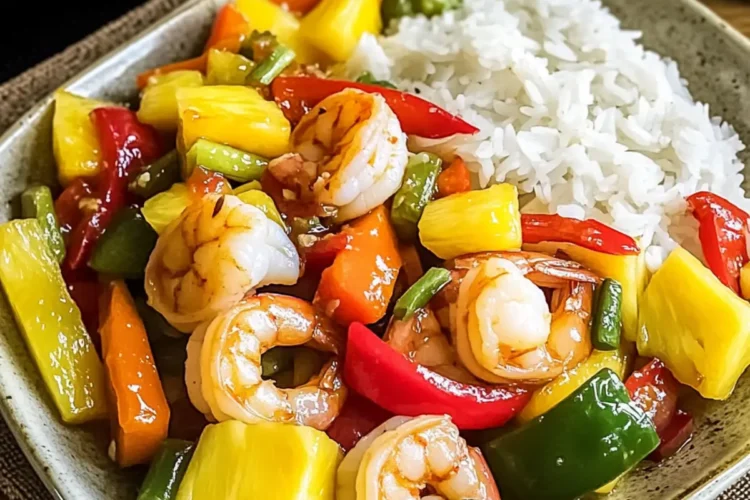 Vibrant Freshness: Juicy shrimp mingle with crisp vegetables and sweet pineapple, creating a colorful dish that’ll brighten any dinner table.