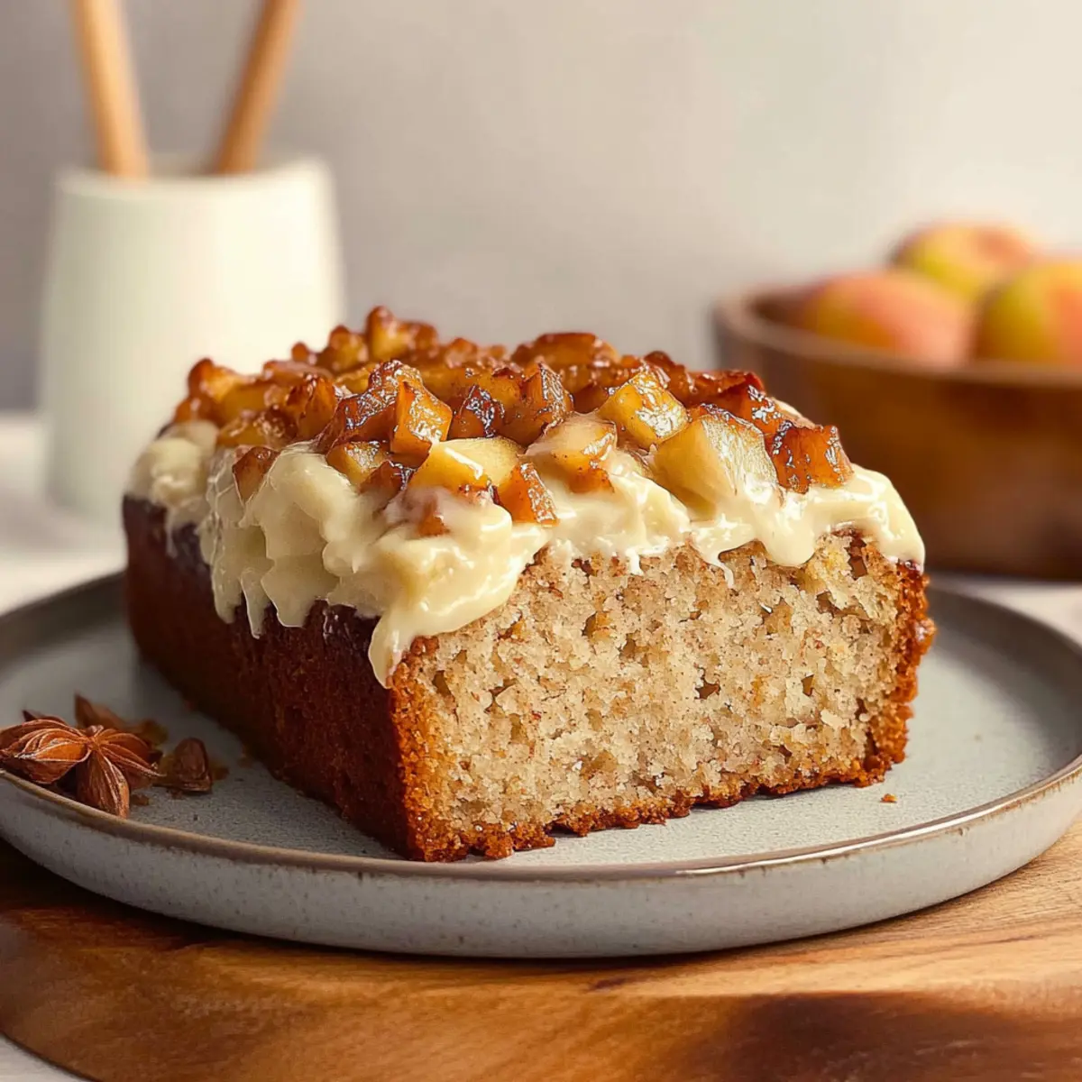 - For optional icing, mix cream cheese with a splash of dairy-free milk until smooth, and spread over cooled bread, topping with caramelized apples if desired.